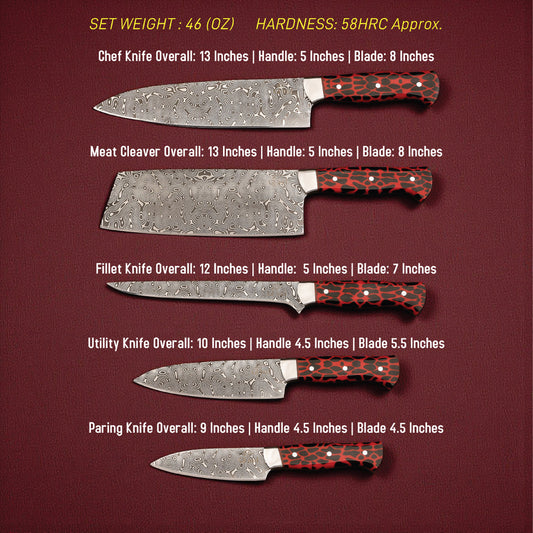 GFind Pro. Kitchen Chef Set | 12C27 Stainless Steel Blade with Etching Style, Hand-Forged with Red Resin Handles