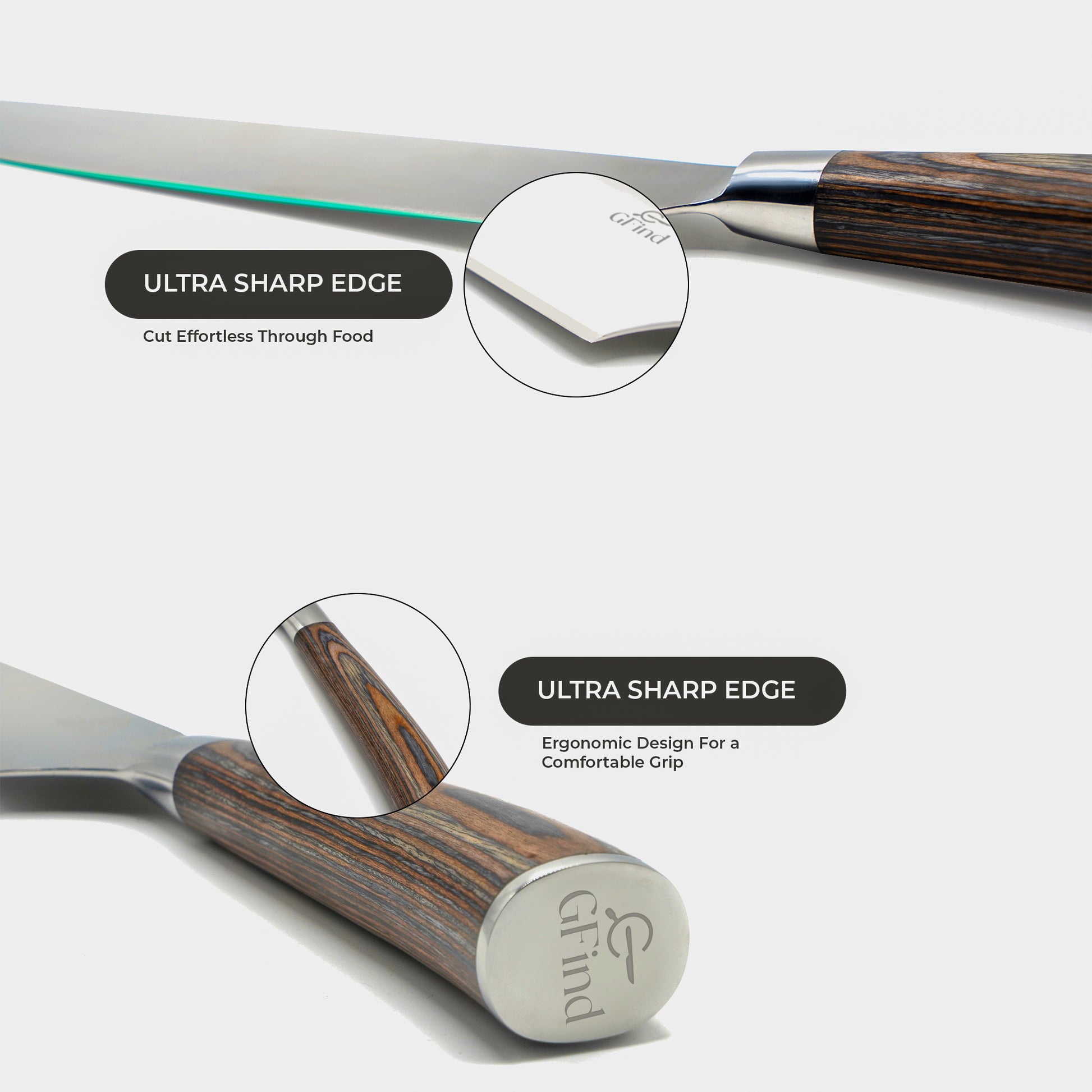 - 🔪 ERGONOMICALLY DESIGNED FOR YOU - Japanese knife Featuring an exclusive Pakka wood handle, GFind's chef knife ensures a fatigue-free grip, balancing lightweight finesse with a sturdy build, for comfortable, nimble, and precise handling